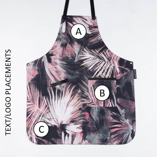 A quality printed light cotton 100% with oval cut, cross-back straps for comfortable fit, textile patch pocket with black top lining and leather towel holding clip.