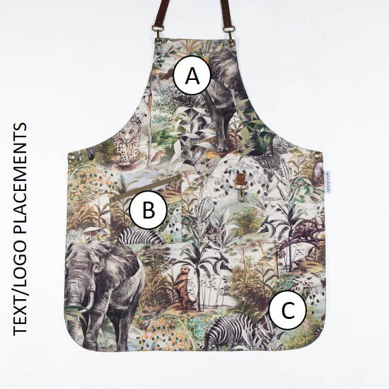 A quality printed light cotton 100% with oval cut, cross-back straps for comfortable fit, textile patch pocket with olive green top lining and brown leather towel holding clip strap.