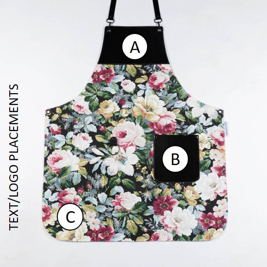 A quality printed light linen 100% cotton with oval cut, black suede leather, cross-back straps for comfortable fit, black suede leather patch pocket and leather towel ring strap.