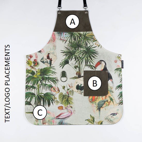 A quality printed light cotton 100% with oval cut, olive green nubuck leather, cross-back straps for comfortable fit, nubuck leather patch pocket and leather towel ring strap.