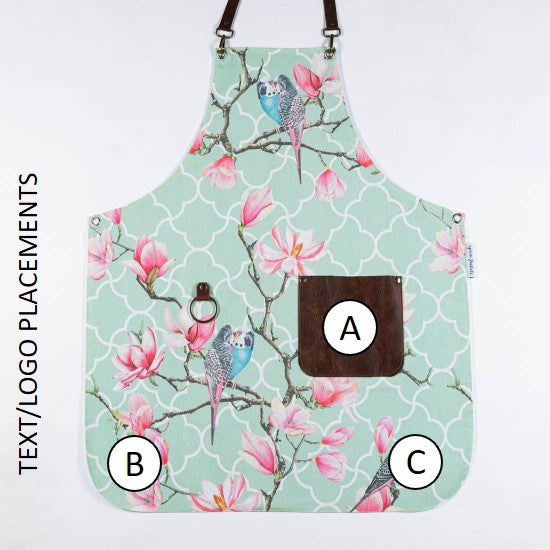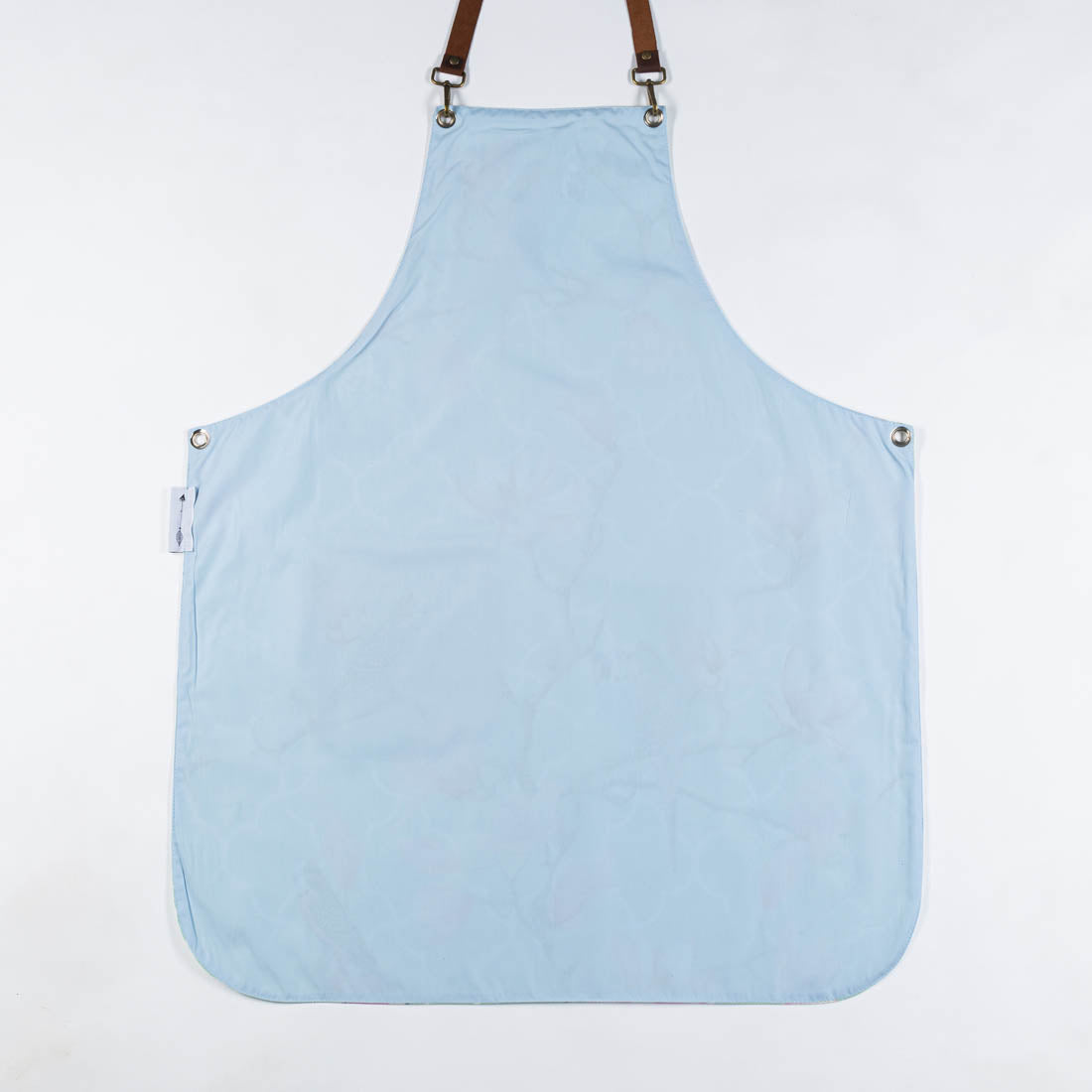 A quality printed 100% poly with oval cut, cross-back straps for comfortable fit, brown leather patch pocket and leather towel ring strap.