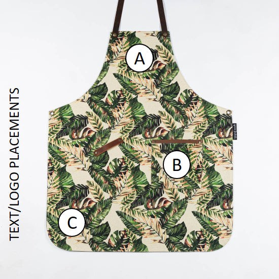 A quality printed linen 100% cotton with oval cut, cross-back straps for comfortable fit, textile patch pocket with brown top lining and leather towel holding strap.