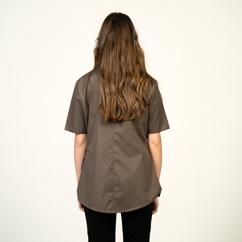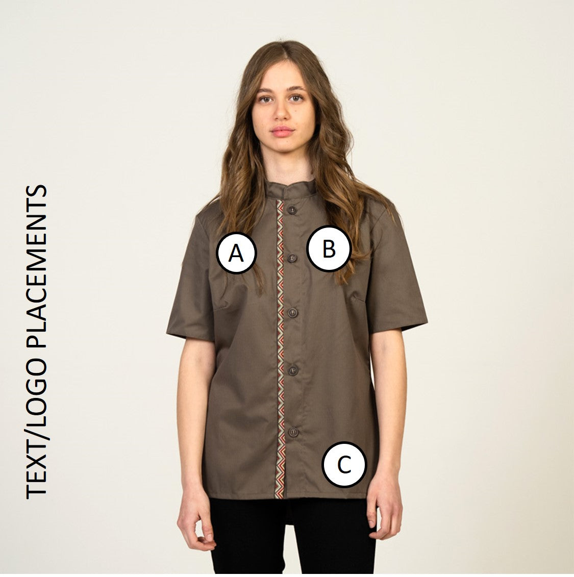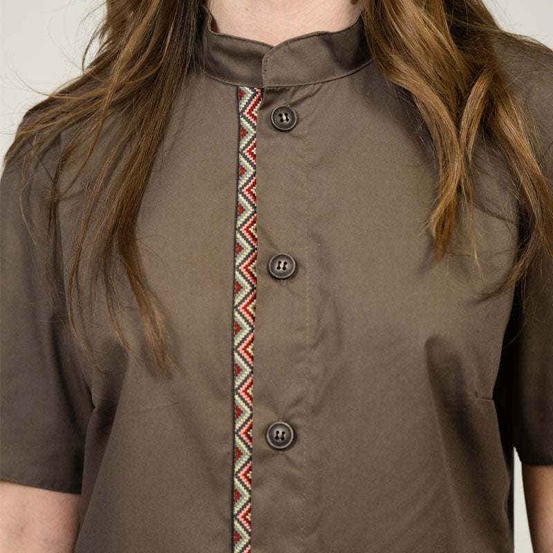 - Design: Loose fit with comfortable cuts, short old-school sleeves. Mao collar and antique brown button front closure.
