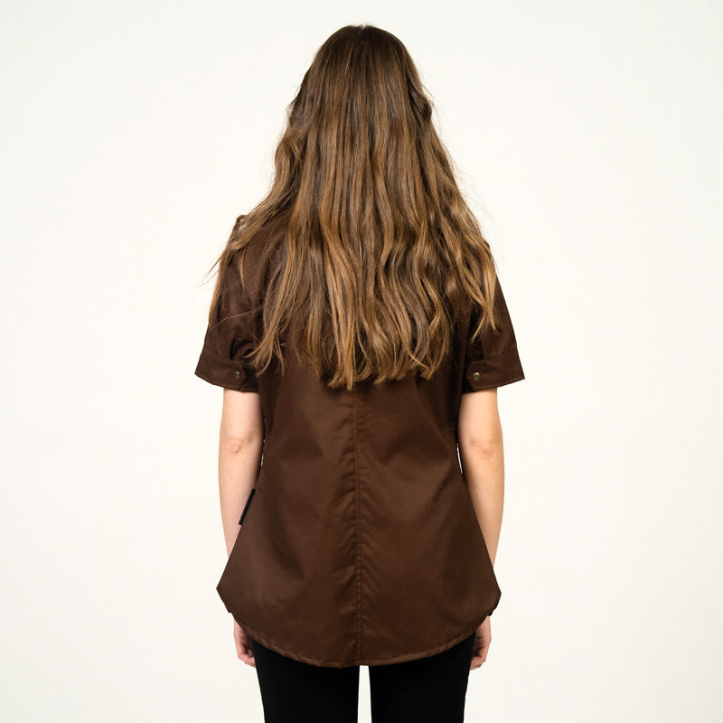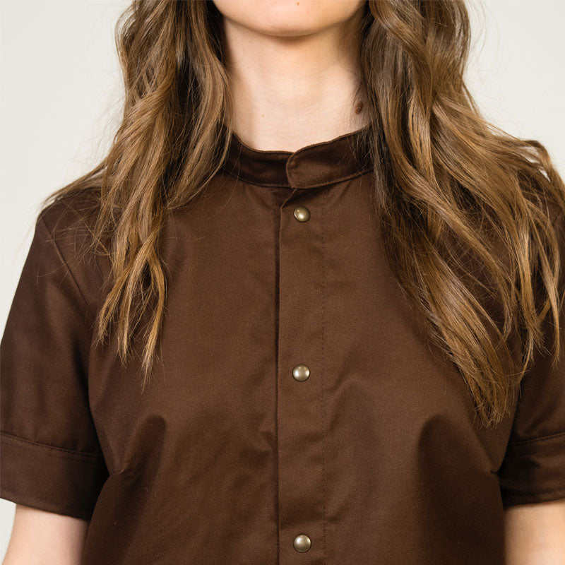 - Design: Loose fit with comfortable cuts, short old-school sleeves with cuffs. Mao collar and bronze button front closure.