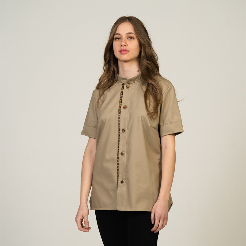 - Design: Loose fit with comfortable cuts, short old-school sleeves with cuffs, Mao collar and tartaruga button front closure.
