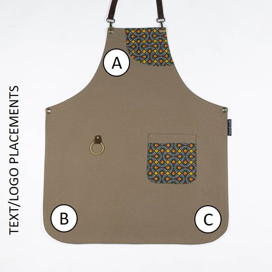 An ultra durable canvas with oval cut, cross-back straps for comfortable fit, textile patch pocket with top lining and brown leather towel ring.