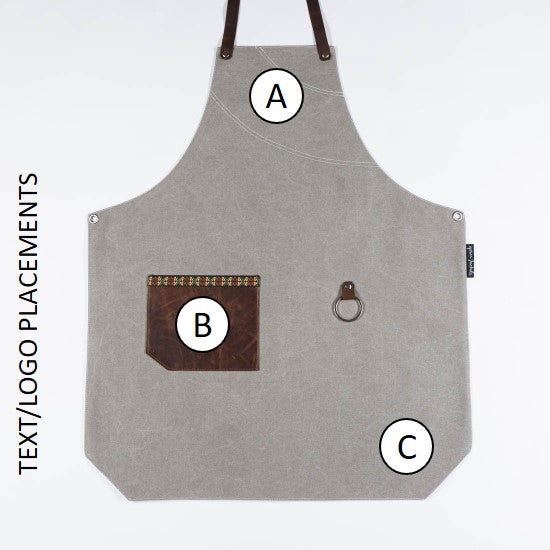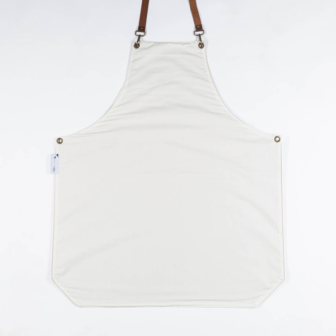 An ultra durable stonewash canvas with polygon cut, cross-back straps for comfortable fit, brown leather patch pocket and leather towel ring.