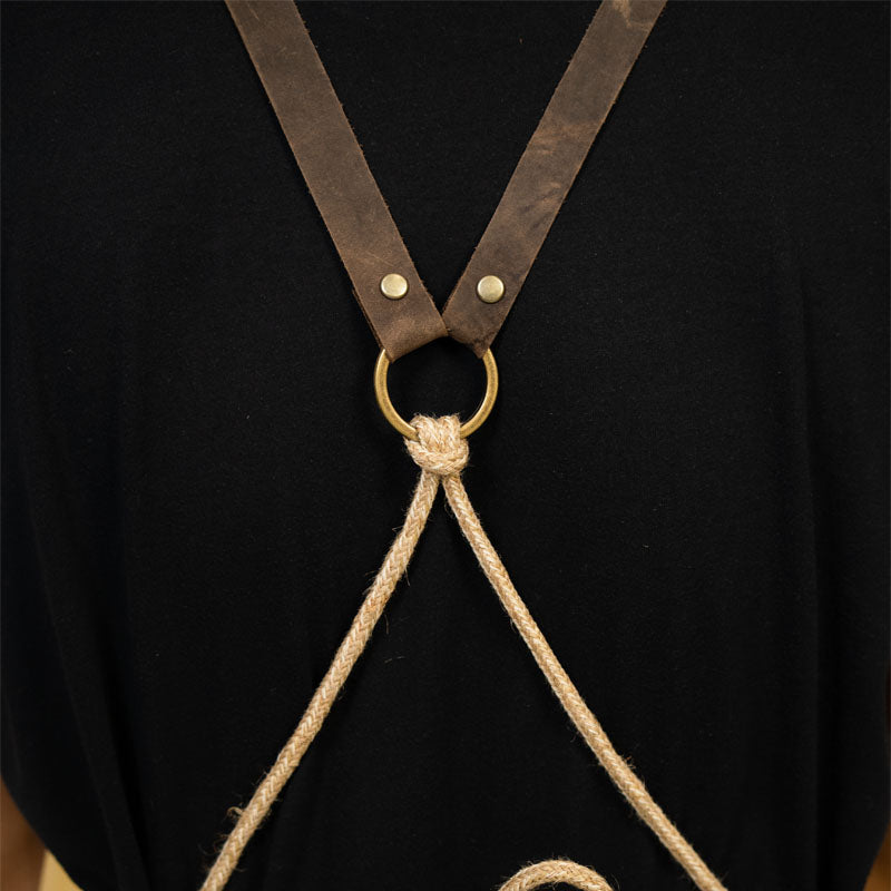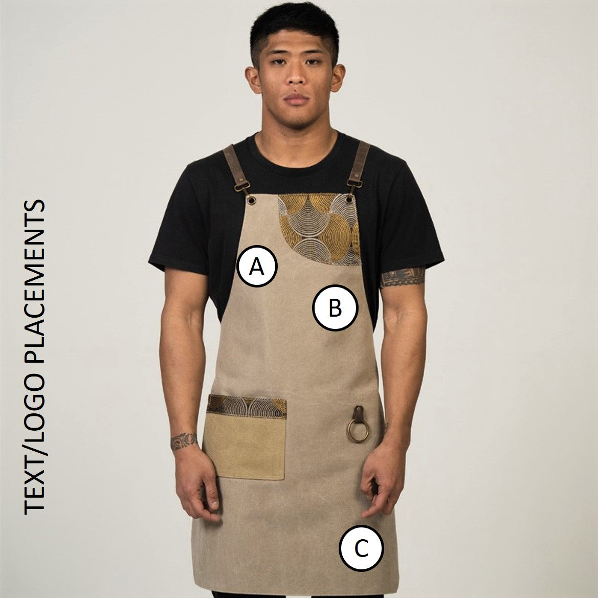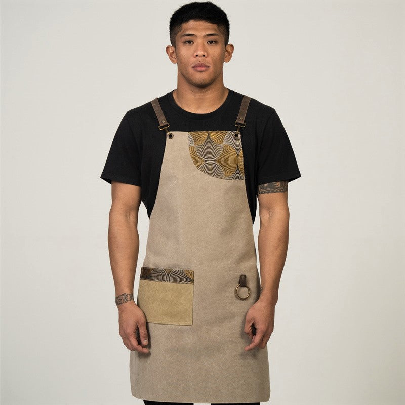 An ultra durable stonewash canvas with polygon cut, cross-back straps for comfortable fit, textile mustard patch pocket with top lining and dark brown leather towel ring.