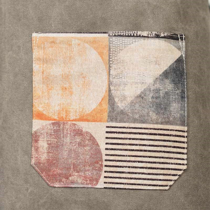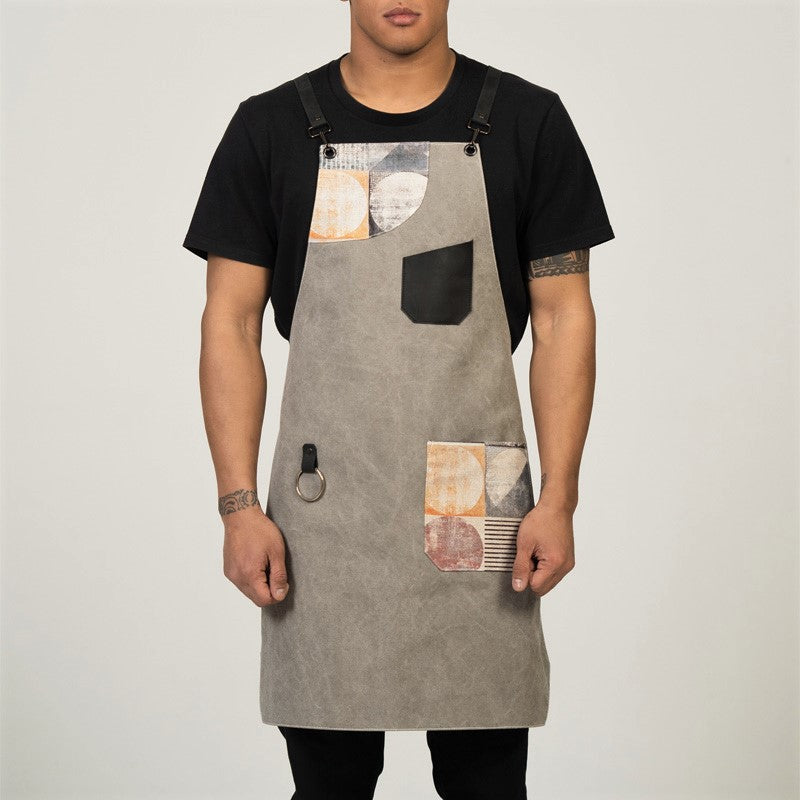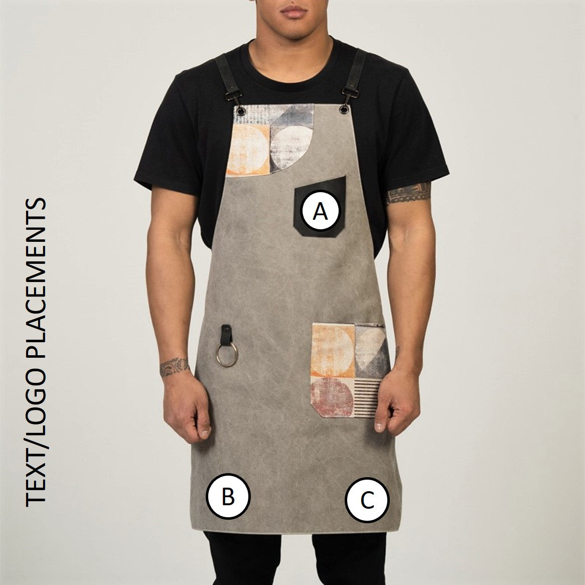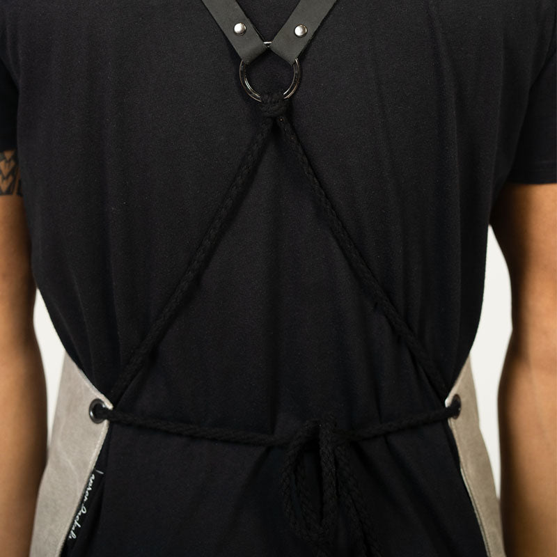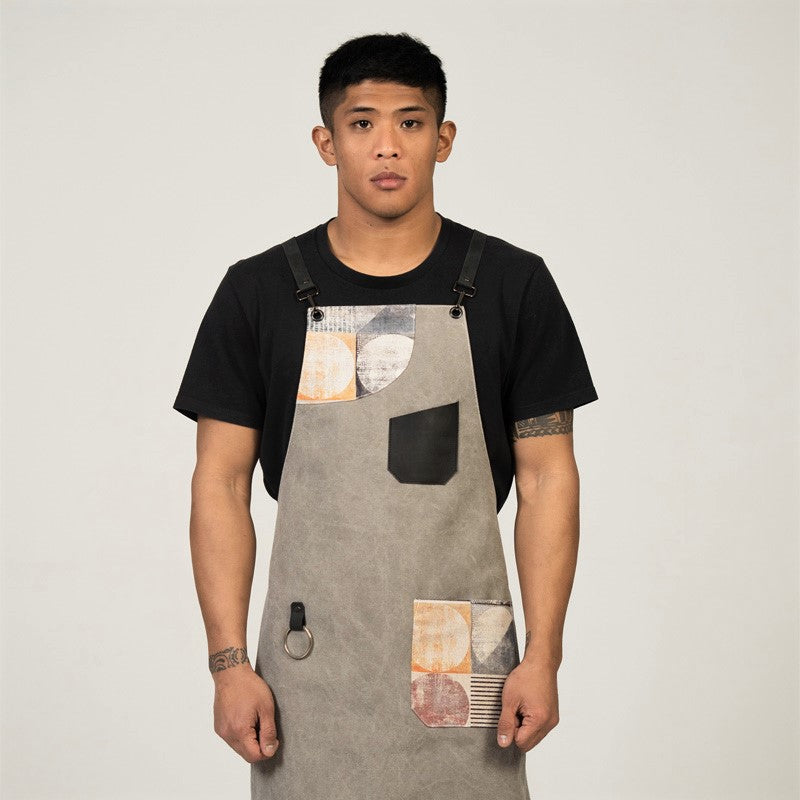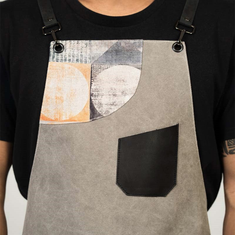 An ultra durable stonewash canvas with polygon cut, cross-back straps for comfortable fit, black leather patch pocket on top, textile patch pocket and black leather towel ring.