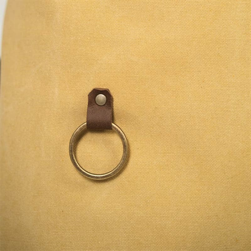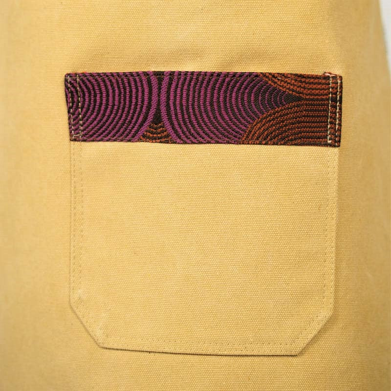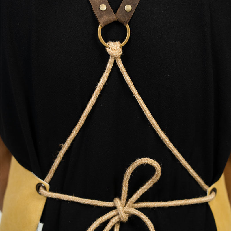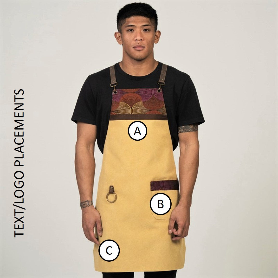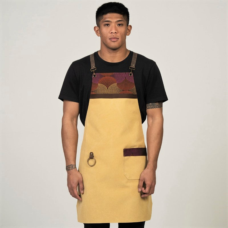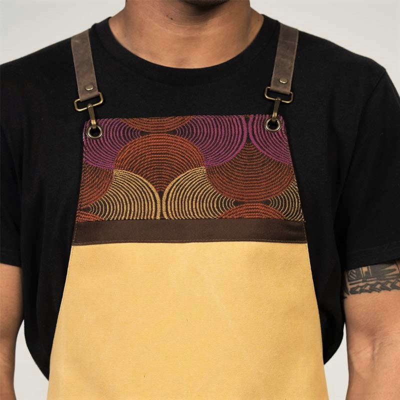 An ultra durable stonewash canvas with polygon cut, cross-back straps for comfortable fit, textile patch pocket with top lining and brown leather towel ring.